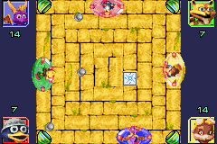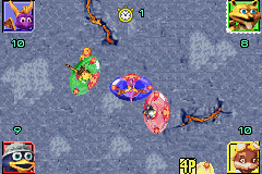 Bridge FightThis game can only be played by two players at a time and is identical to all the other iterations of the game in the single player mode. Player Two plays as the Riptoc at the top and Player One plays as Spyro. Throw bombs at the opponent to attempt to destroy what they're standing on. The one difference with this game if you play against a Crash Fusion cart, is that you are Spyro and your opponent is Crash (if you're the one using the Spyro Fusion game). |