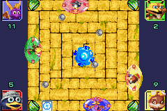 Sheep ShuffleTotally different premise on this game. Instead of attacking your opponents you go around capturing sheep. Press B near to a sheep to capture it and then take it to your coloured circle over in one of the corners. Press B again to drop it. Each sheep in your area will give you one point so accidental ones are possible. You can also steal sheep from other people's goals. |